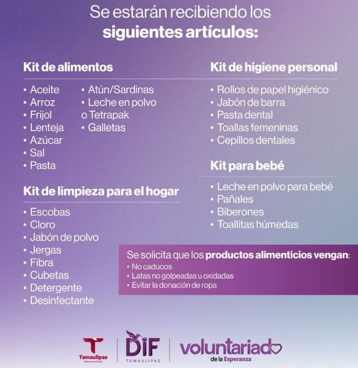Todo lo recolectado será empaquetado y distribuido directamente por el Sistema DIF Tamaulipas en Reynosa y en otros municipios de la frontera norte que han sufrido daños por las lluvias e inundaciones.
